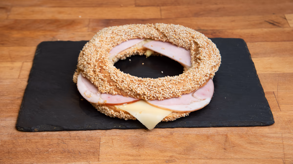 Κουλούρι Θεσσαλονίκης παραδοσιακό γεμιστό με τυρί, μαγιονέζα, μπριζόλα