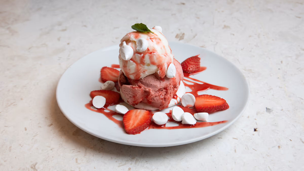 Με παγωτό sorbet φράουλα, παγωτό βανίλια, φρέσκες φράουλες και mini marshmallows