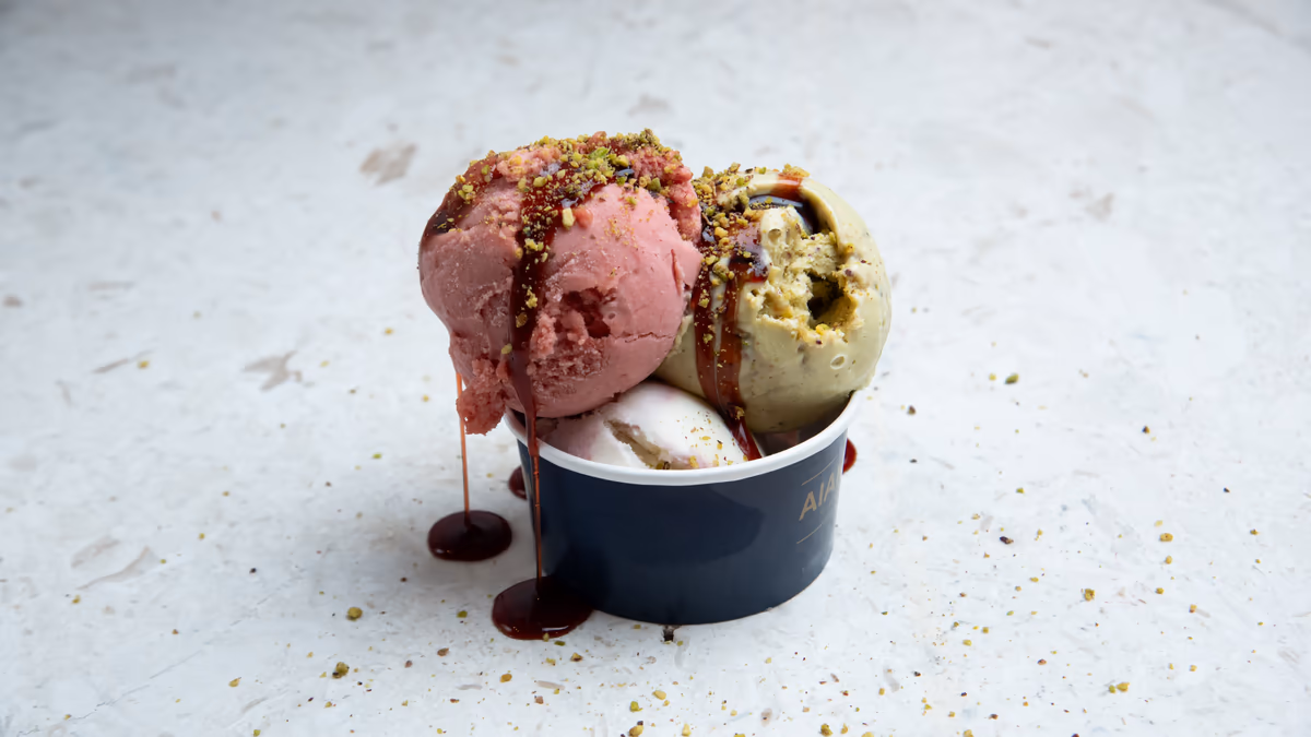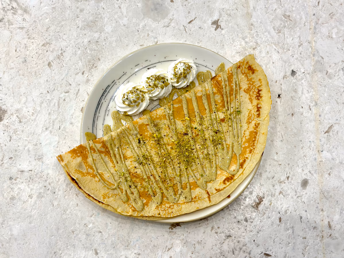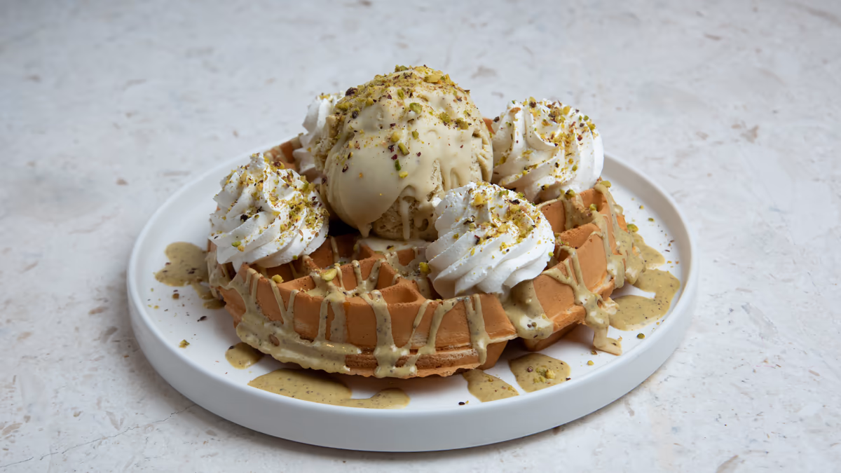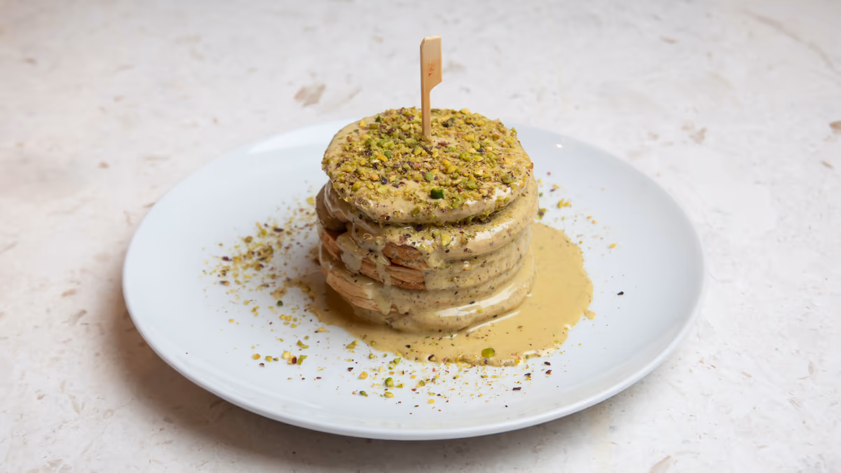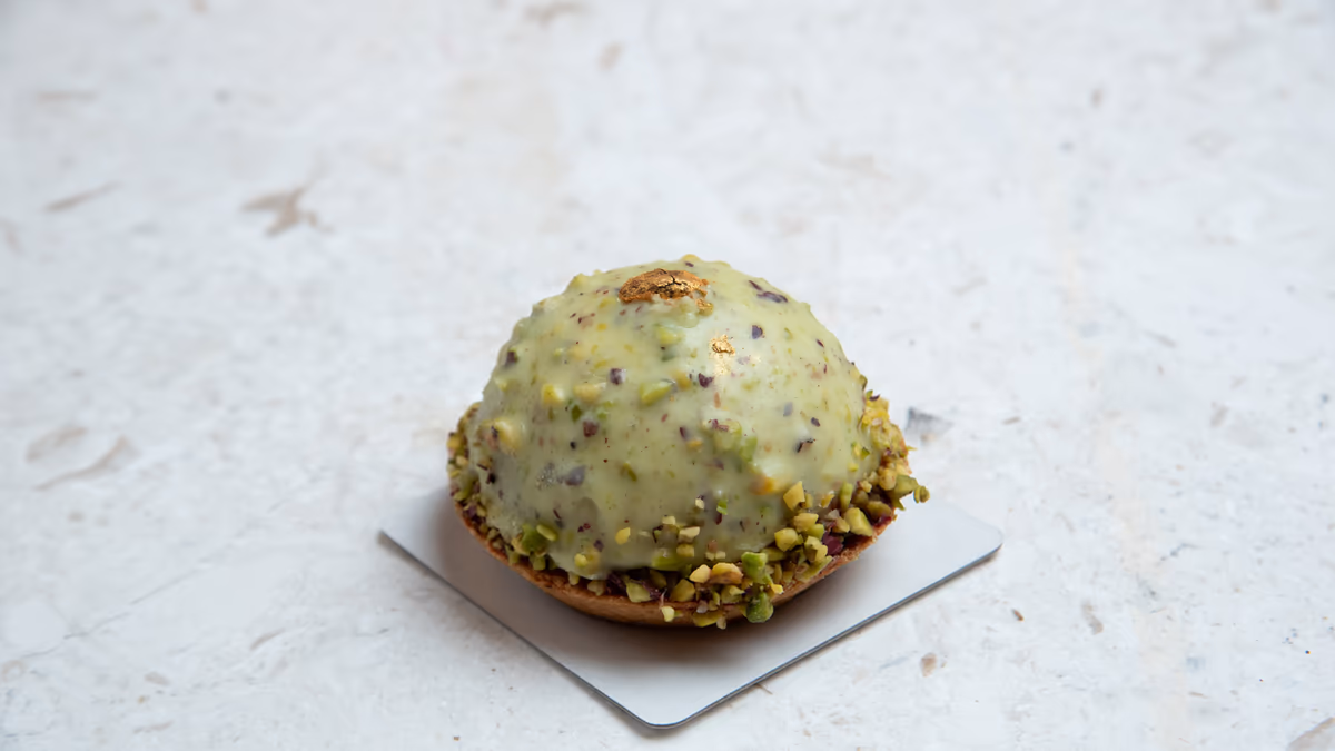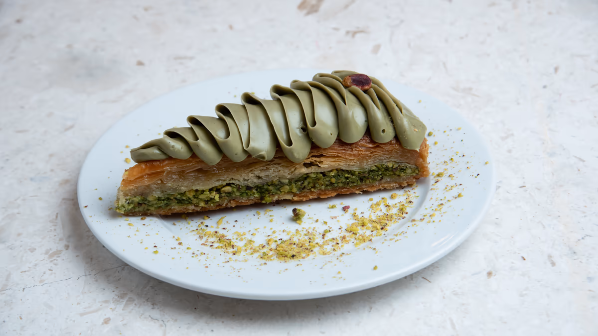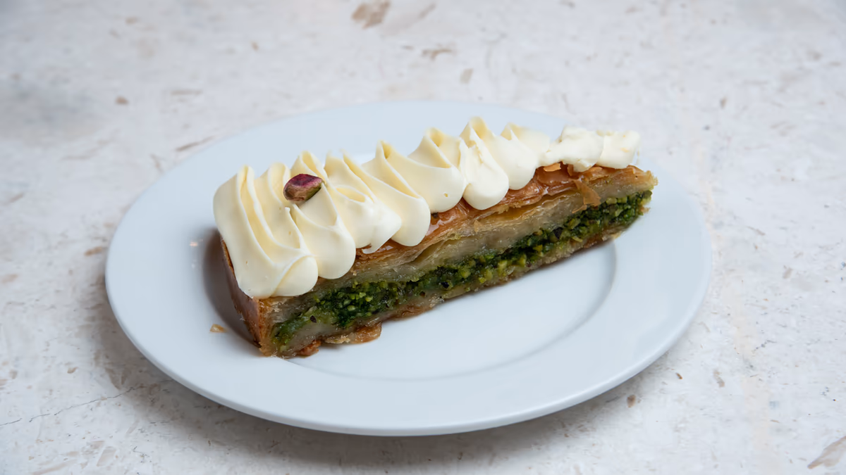 Με κρέμα φυστικιού Αιάκειον, σοκολάτα λευκή, σαντιγύ, παγωτό φυστίκι και τριμμένο φυστίκι
