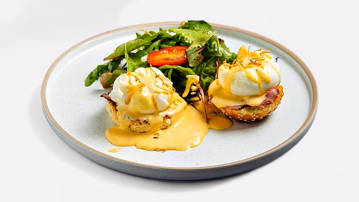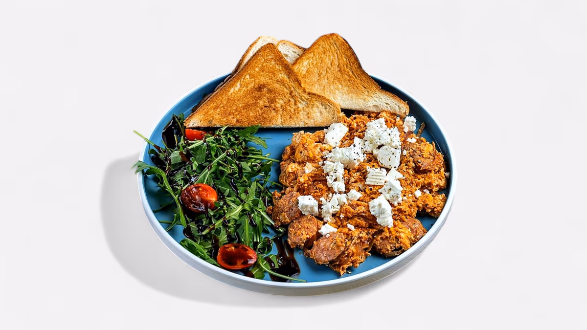 3 Αυγά, τυρί edam, μπέικον, λουκάνικο, ζαμπόν, ντομάτα. Συνοδεύεται απο φρέσκια πράσινη σαλάτα και φρυγανισμένο ψωμί