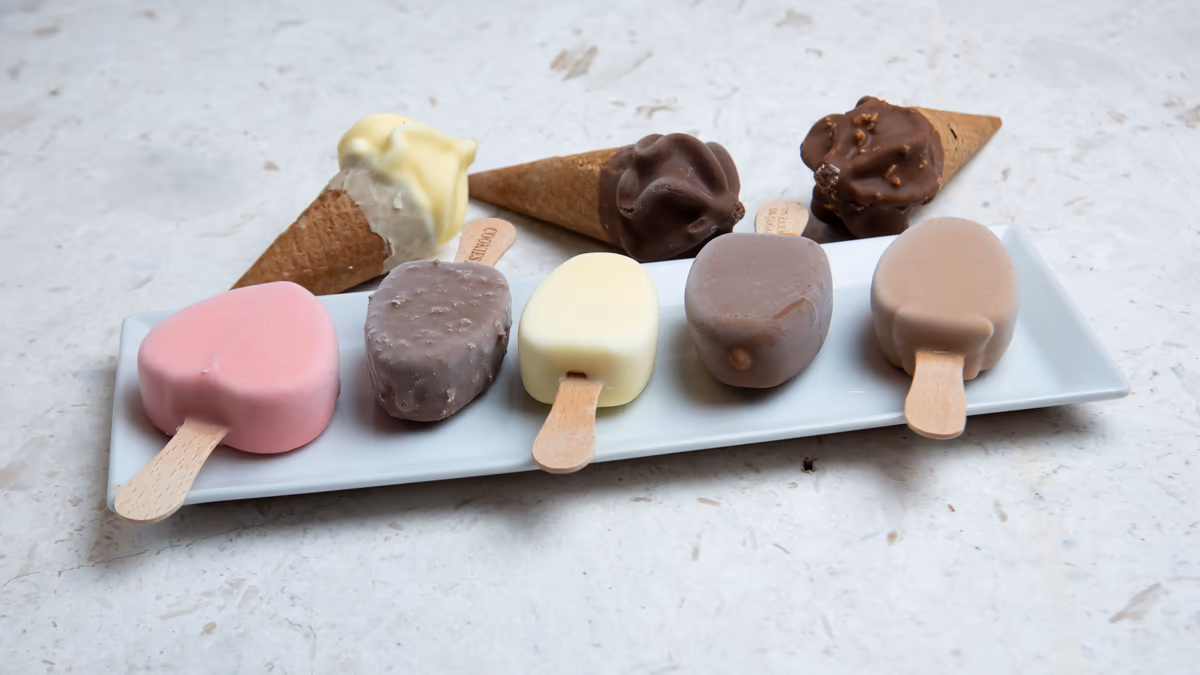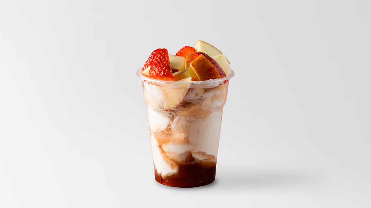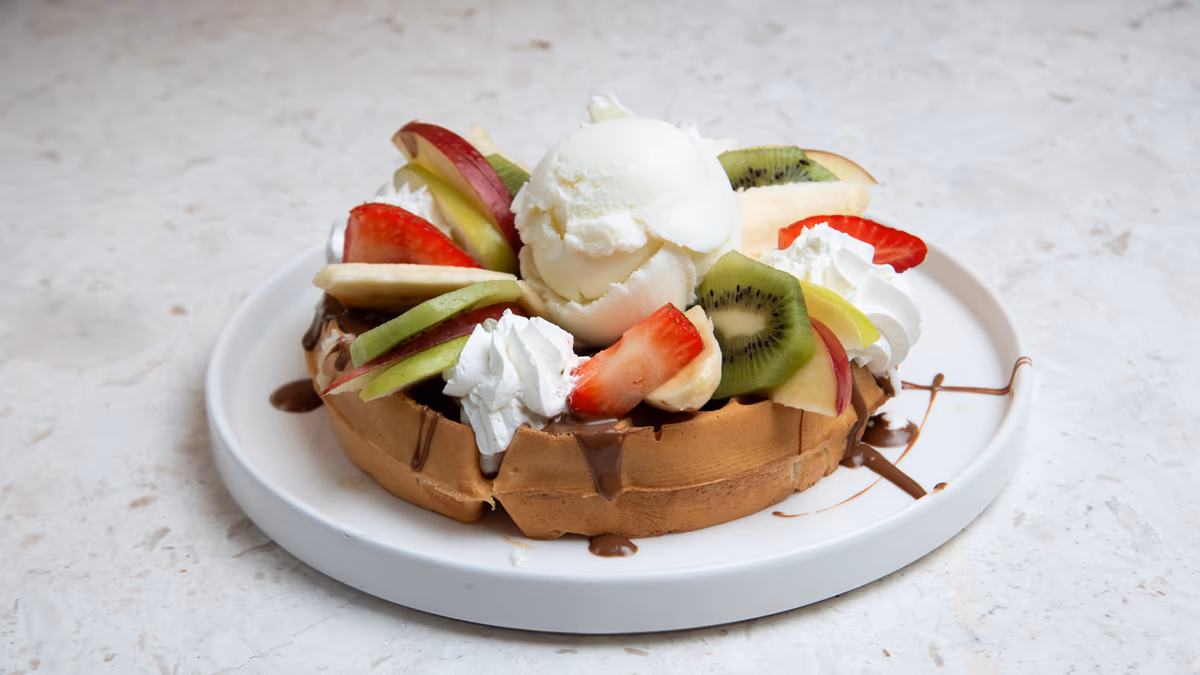 Με σοκολάτα γάλακτος, φρέσκια μπανάνα, φράουλα, ακτινίδιο, σαντιγί και παγωτό βανίλια ή επιλογής