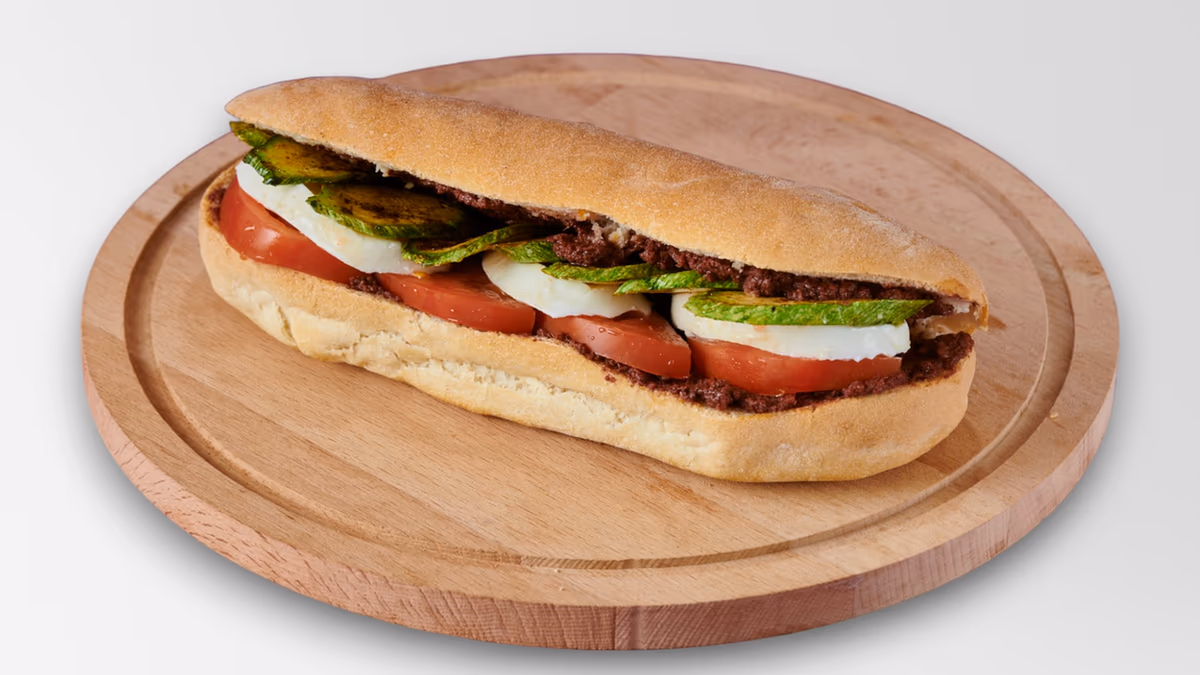 Με ciabatta πολύσπορη, μανιτάρια πλευρώτους, κολοκυθάκια ψητά, πιπεριές Φλωρίνης, σάλτσα ψητής ντομάτας. Συνοδεύεται απο φρέσκια πράσινη σαλάτα