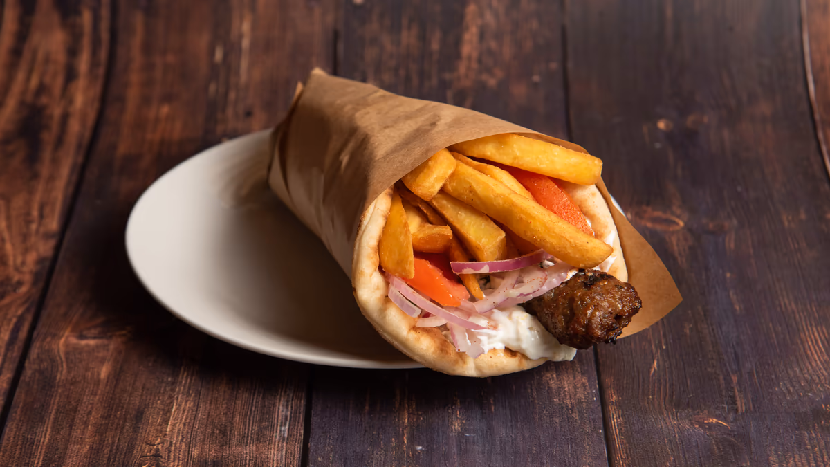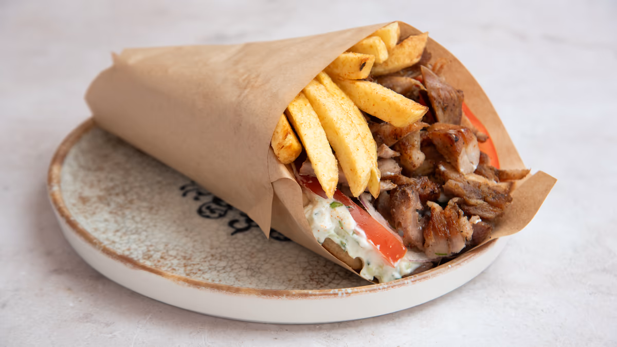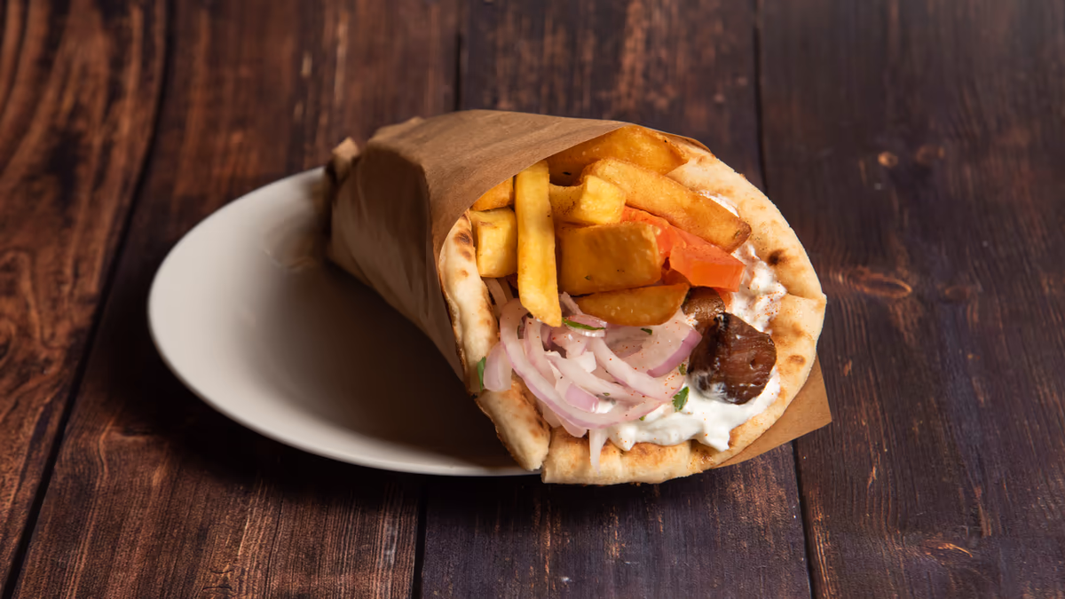 Με πατάτες τηγανητές, ντομάτα, κρεμμύδι, τζατζίκι και 1 πίτα της επιλογής σου