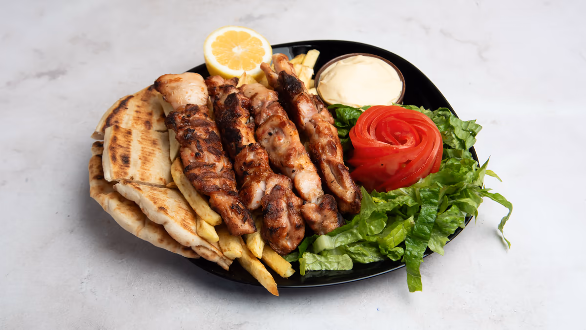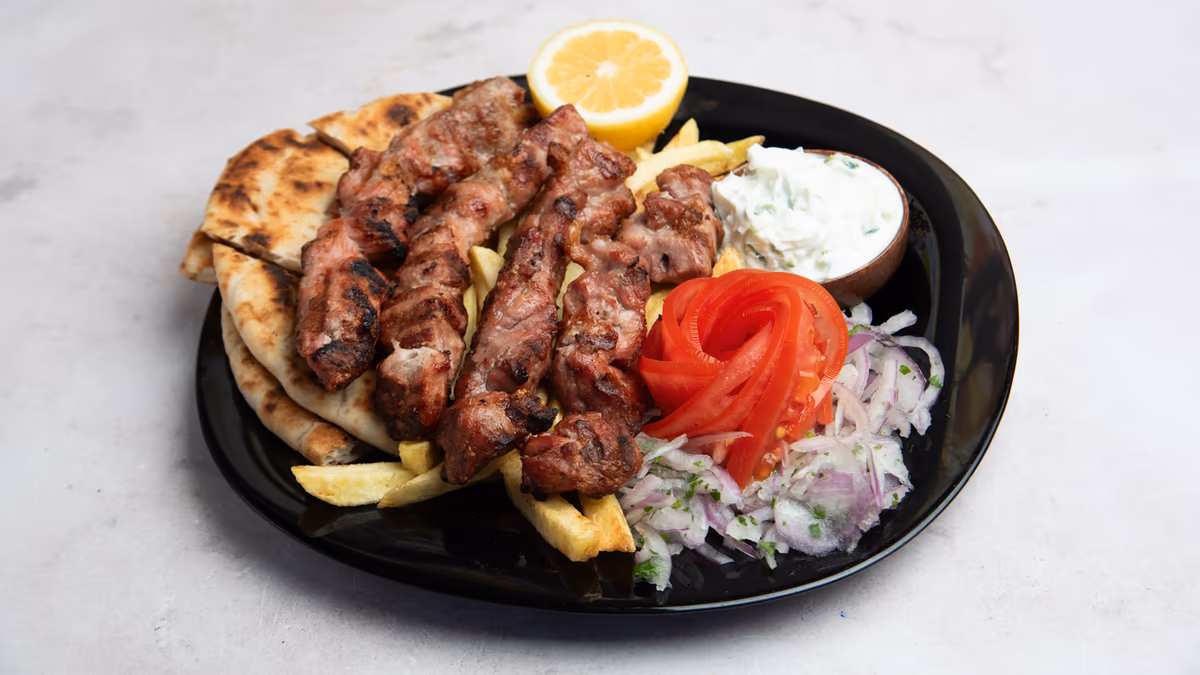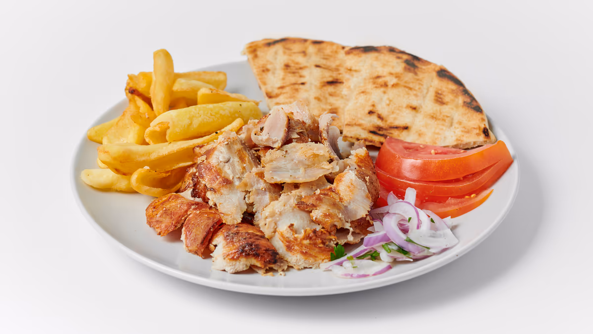 2 Τεμάχια (22-250 g). Με πατάτες τηγανητές, ντομάτα, κρεμμύδι, τζατζίκι και 1 πίτα της επιλογής σου