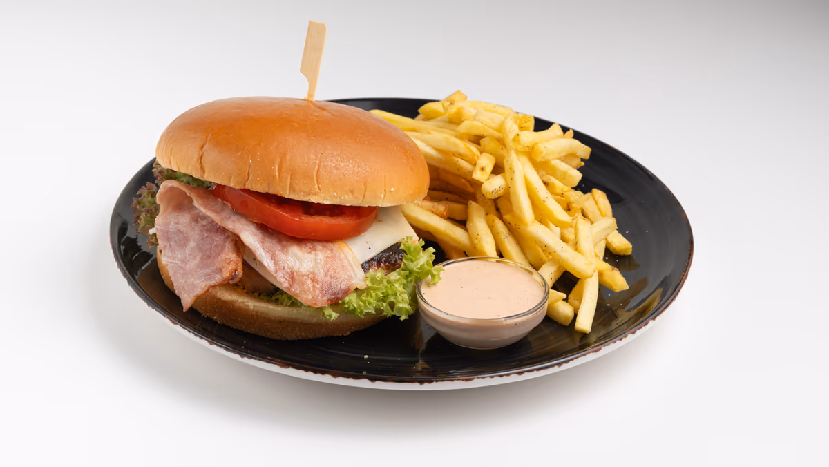 Με μπιφτέκι της επιλογής σου, gouda, μπέικον, ντομάτα, iceberg, καραμελωμένο κρεμμύδι, μαγιονέζα και BBQ sauce. Συνοδεύεται από πατάτες τηγανητές
