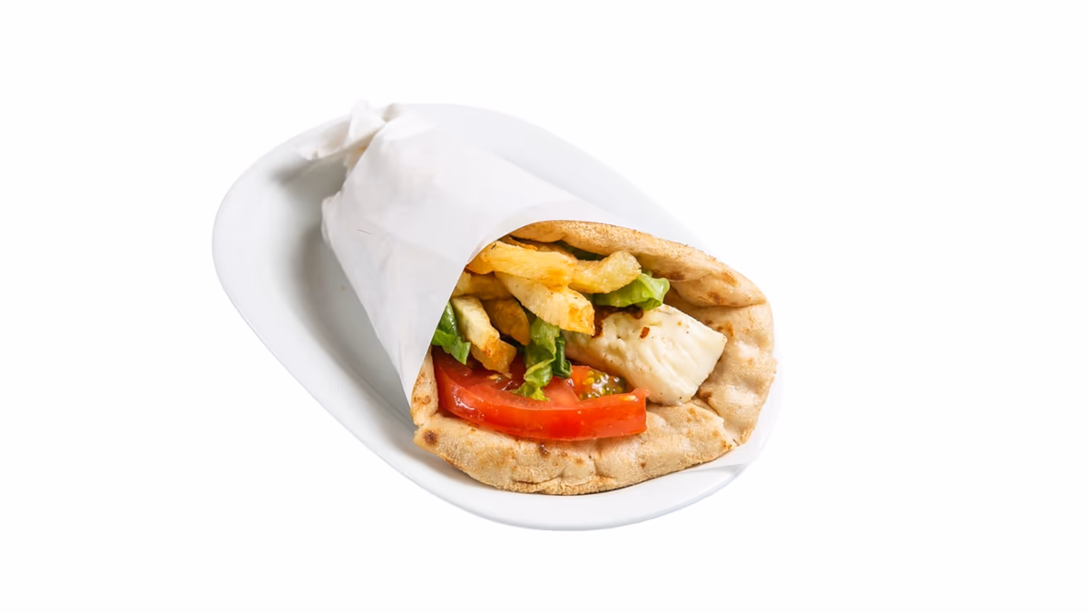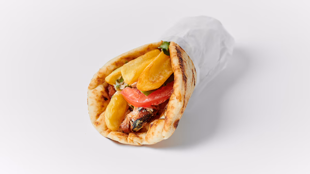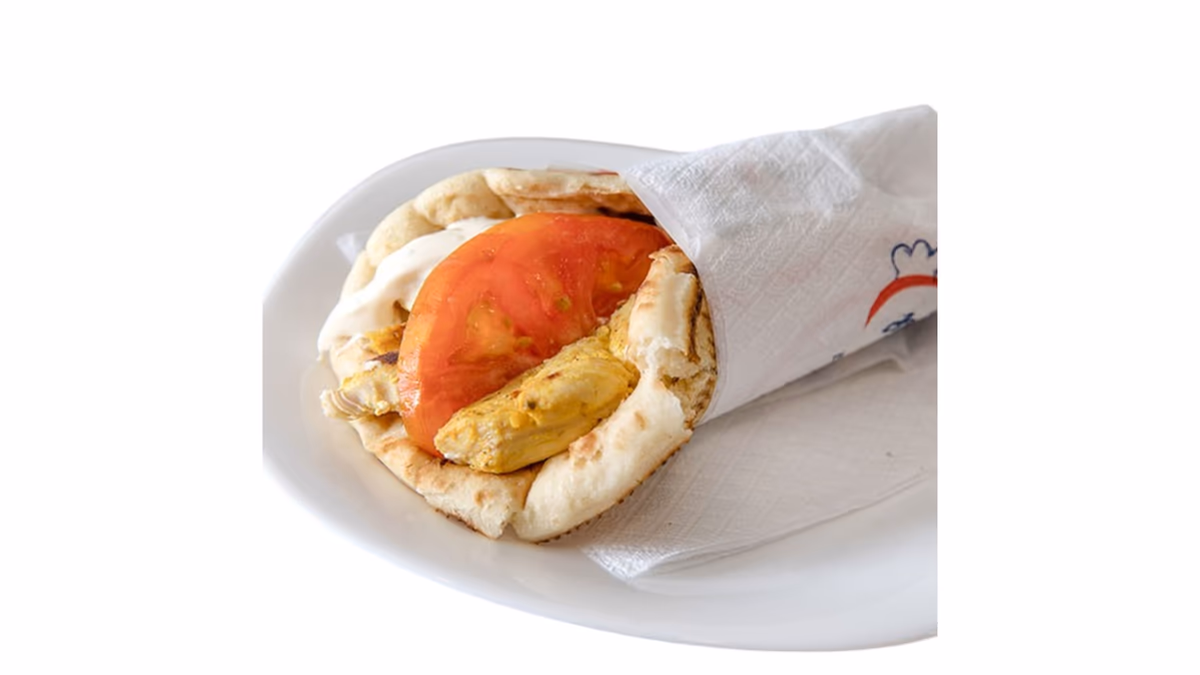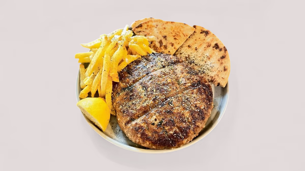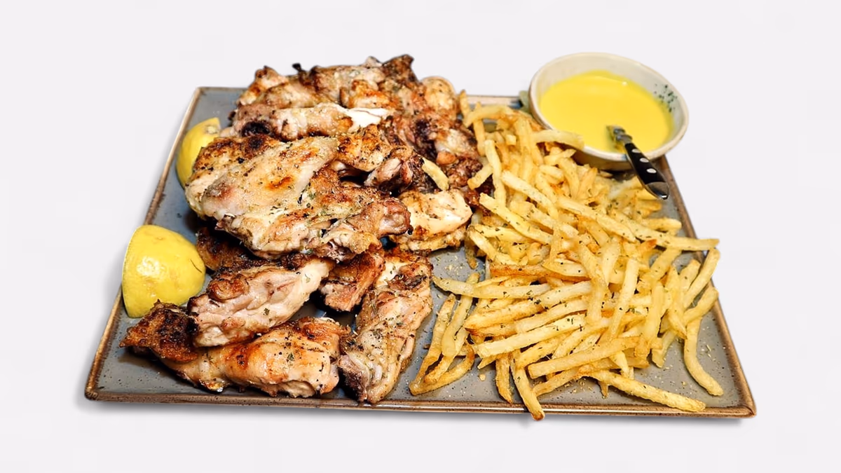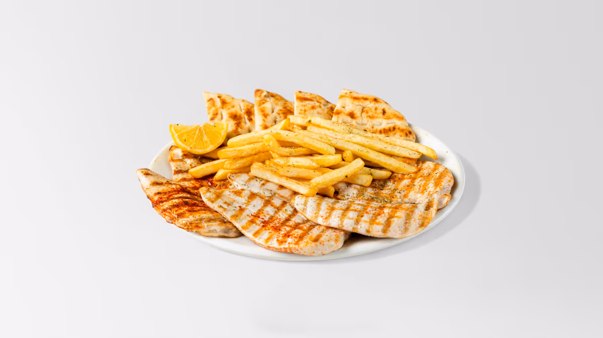 Μισό κοτόπουλο άνευ οστών. Συνοδεύεται από πίτα και πατάτες