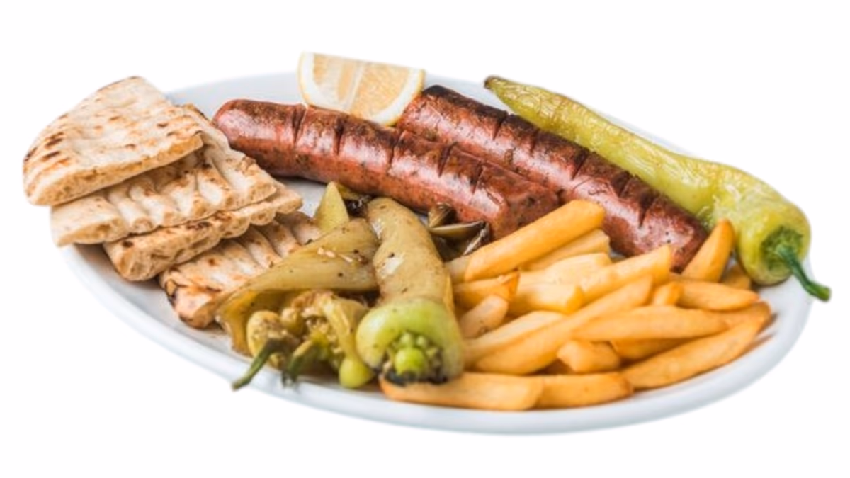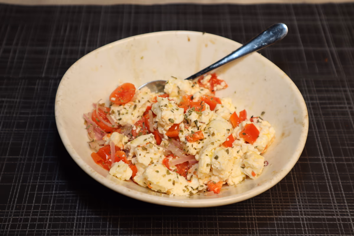 Με ελαιόλαδο, ρίγανη, τυρί φέτα, αγγούρι, ντομάτα, κρεμμύδι, ελιές και πιπέρι